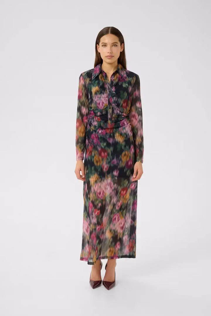 Mönstrad klänning med krage och knappslå framtill. Klänningen är draperad i midja som gör att klänningen får ett vackert fall.