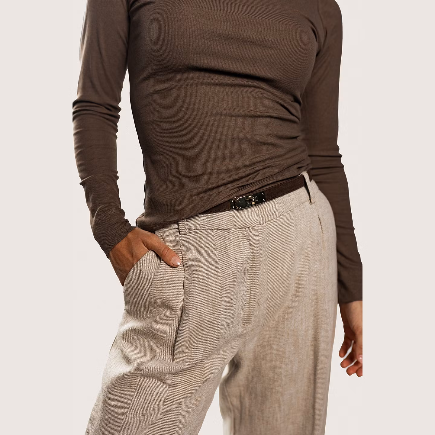 Ett stilrent bälte tillverkat av äkta läder. Bältet har en justerbar längd från 50 cm till 90 cm för optimal komfort och det gyllene vridlåset gör bältet både praktiskt och elegant.