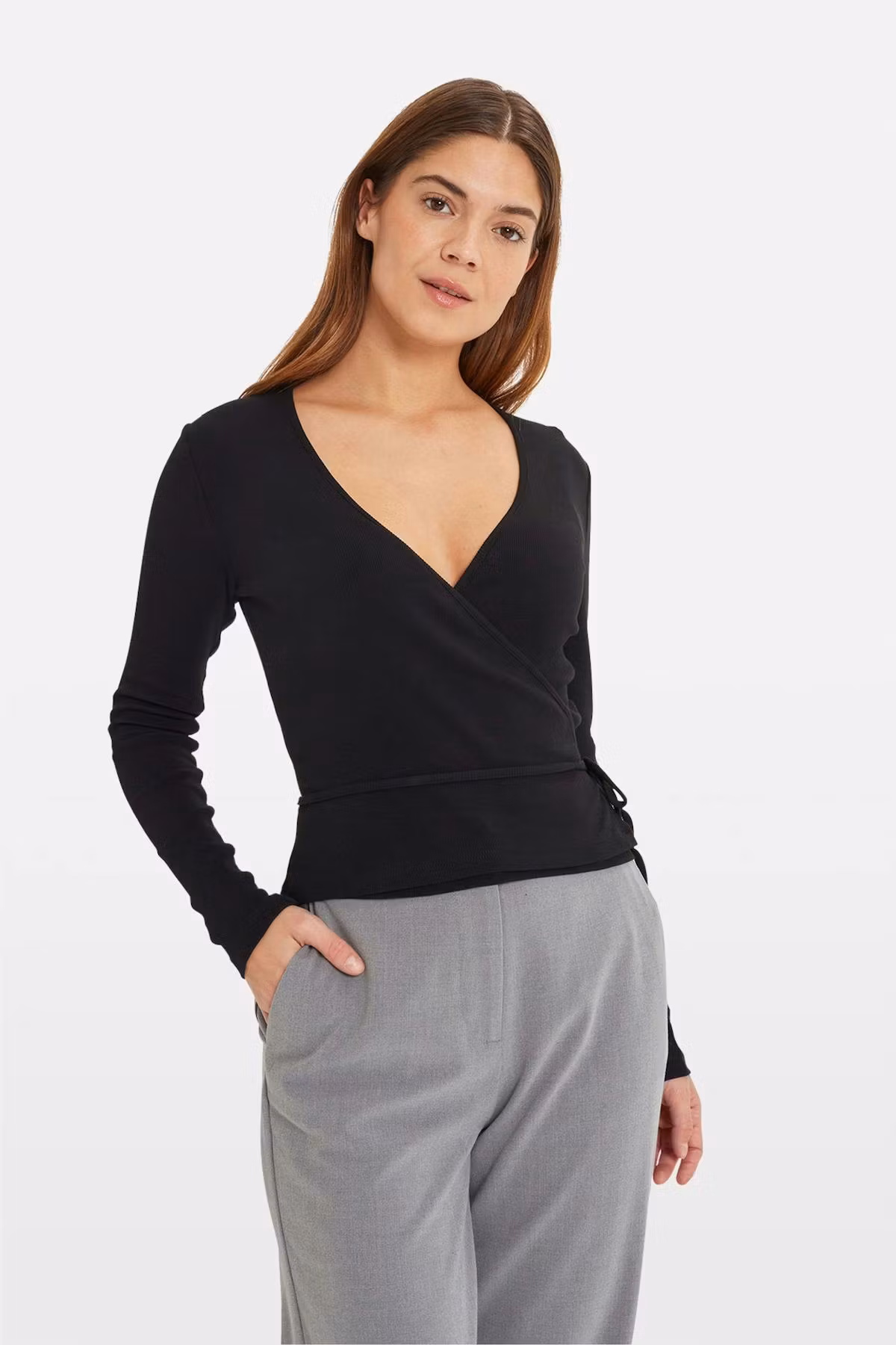 Långärmad, V-ringad topp med omlott-design. Tröjan är tillverkad i ett mjukt och stretchigt bomullsmaterial med ribbstickad struktur. I midjan har toppen ett tygband.