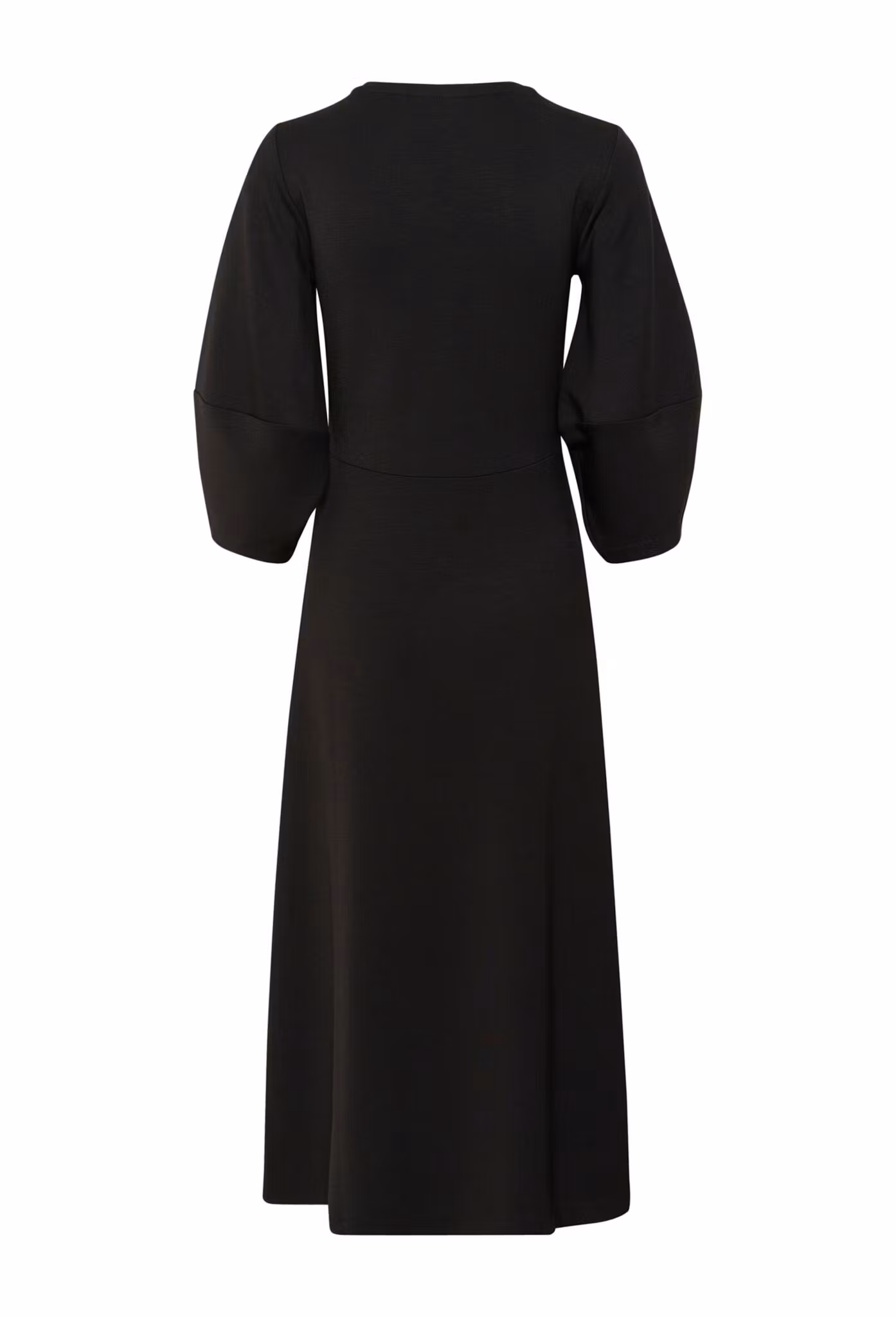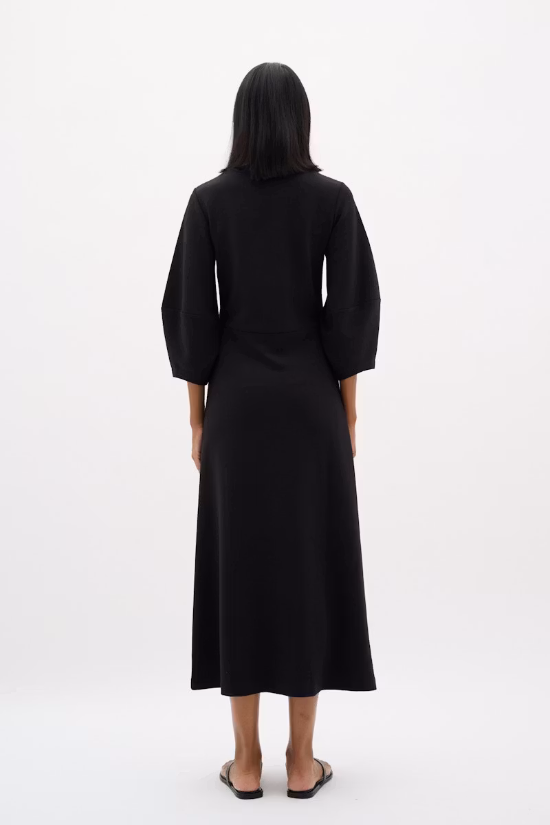 Svart midiklänning tillverkad i en mjuk modalblandning. Klänningen har rundad halsringning och voluminösa trekvartsärmar. Passformen är rak med diskreta sömmar i midjan för en smickrande siluett. Ett bekvämt och mångsidigt plagg för alla tillfällen.