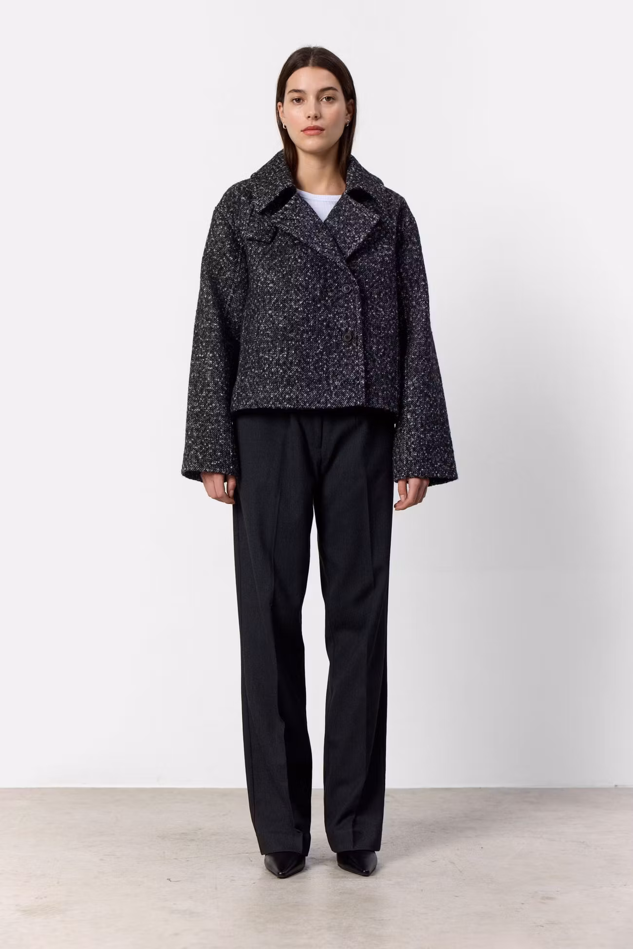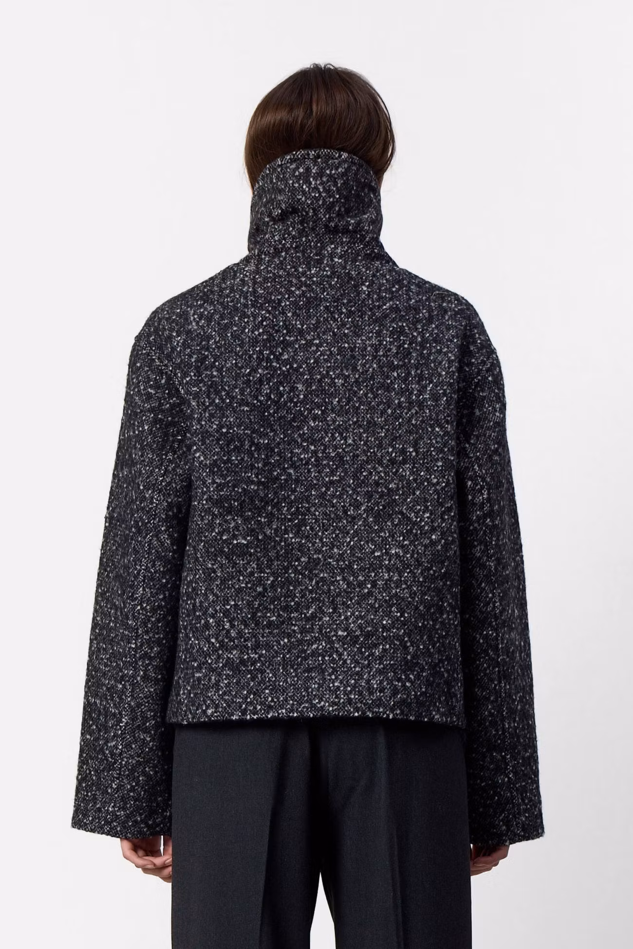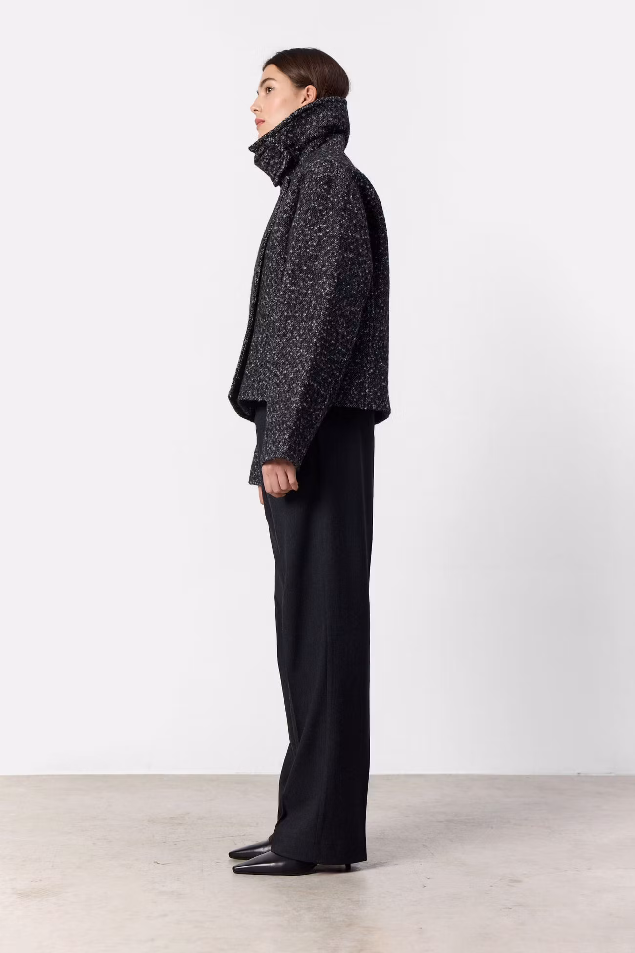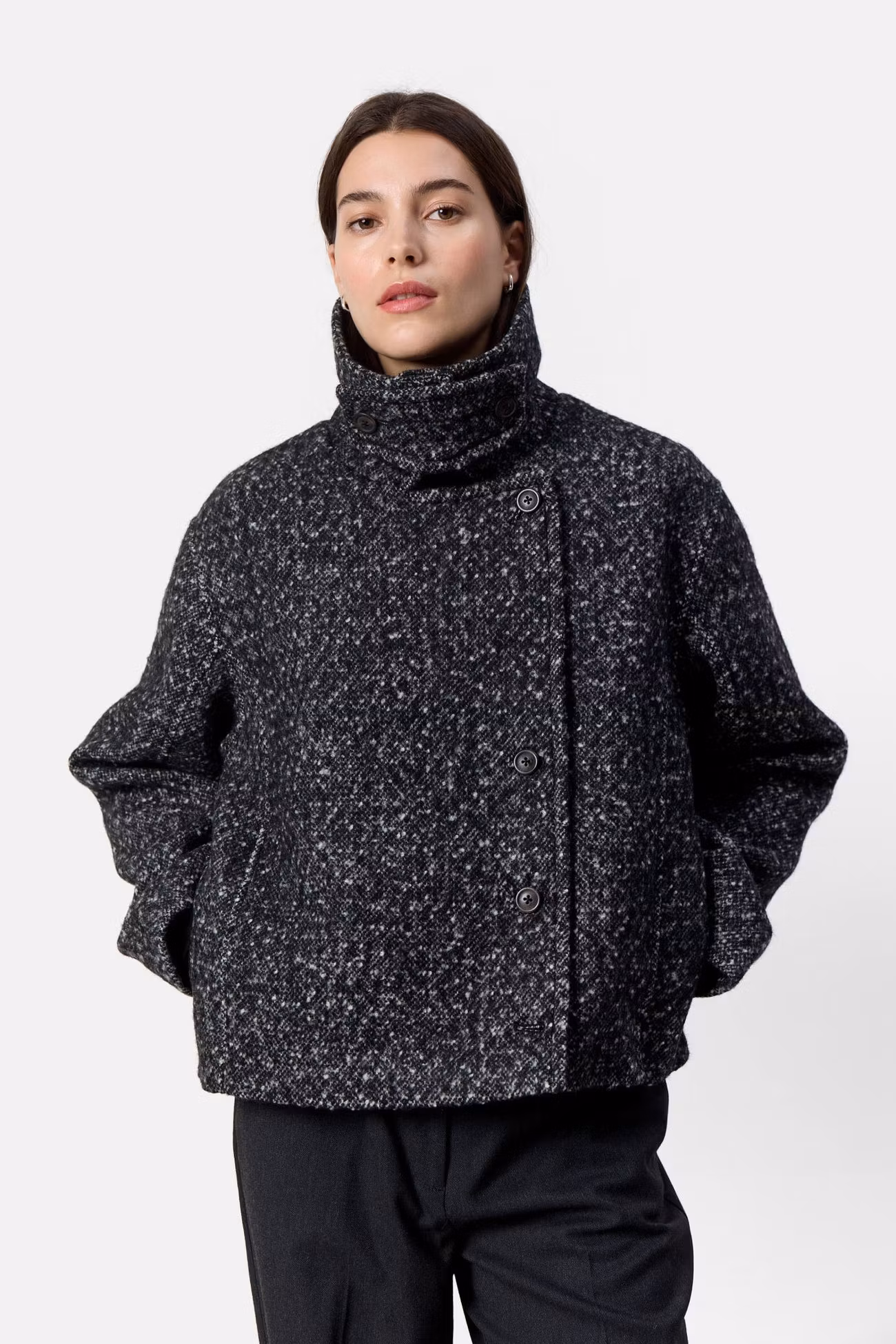 Kort ullkappa med "blazerkrage", men som även kan bäras med hög hals. Jackan har en knappstängning framtill och vida ärmar.