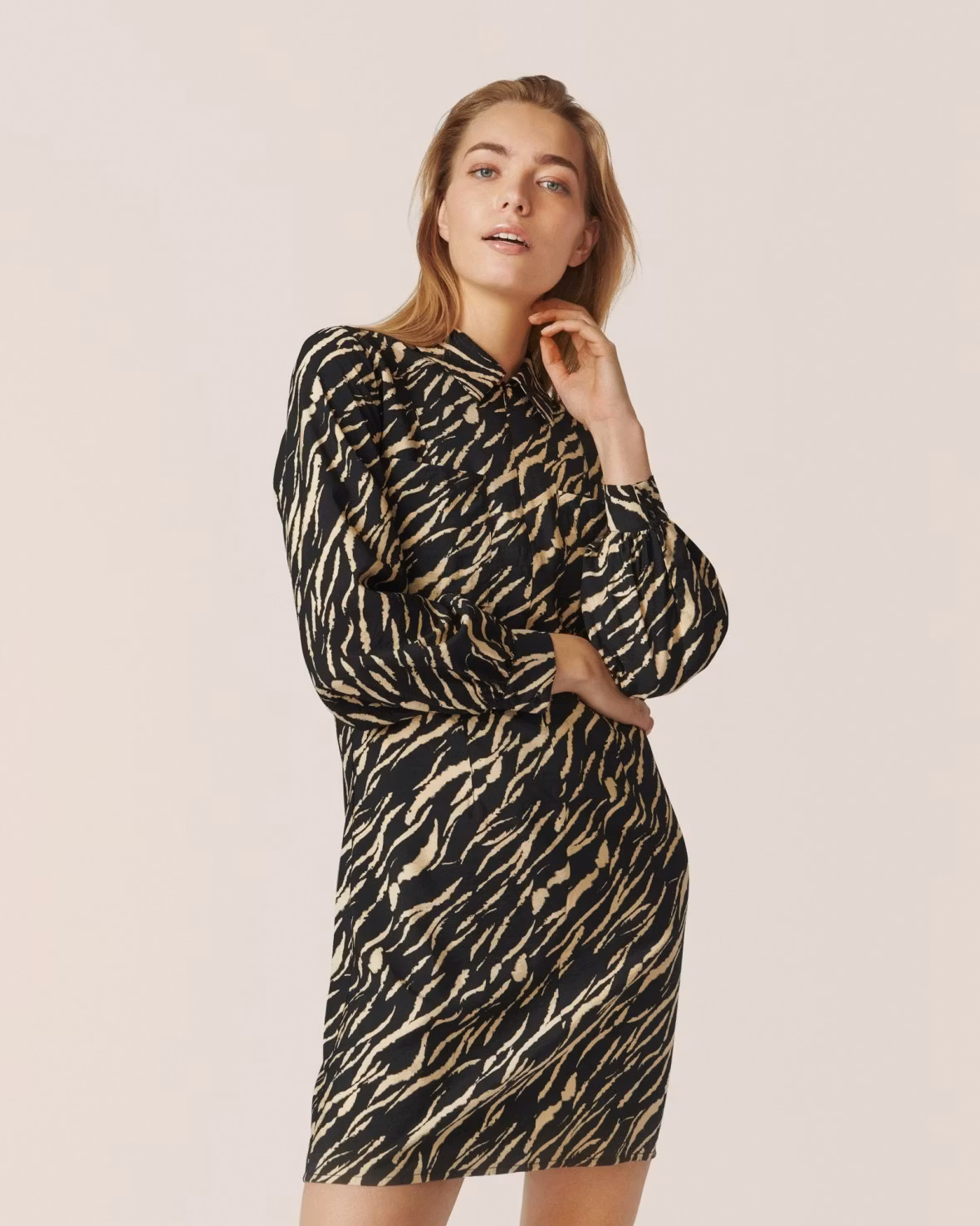 En kort klänning med mönster, volymärmar och skjortkrage.