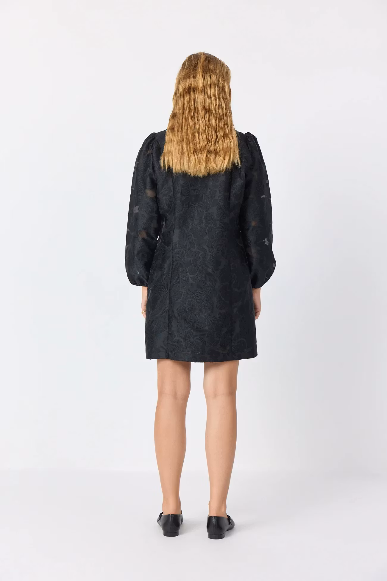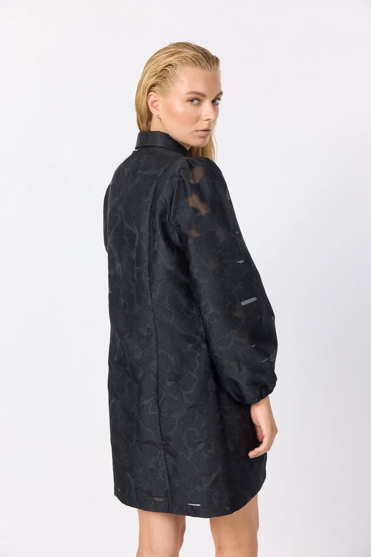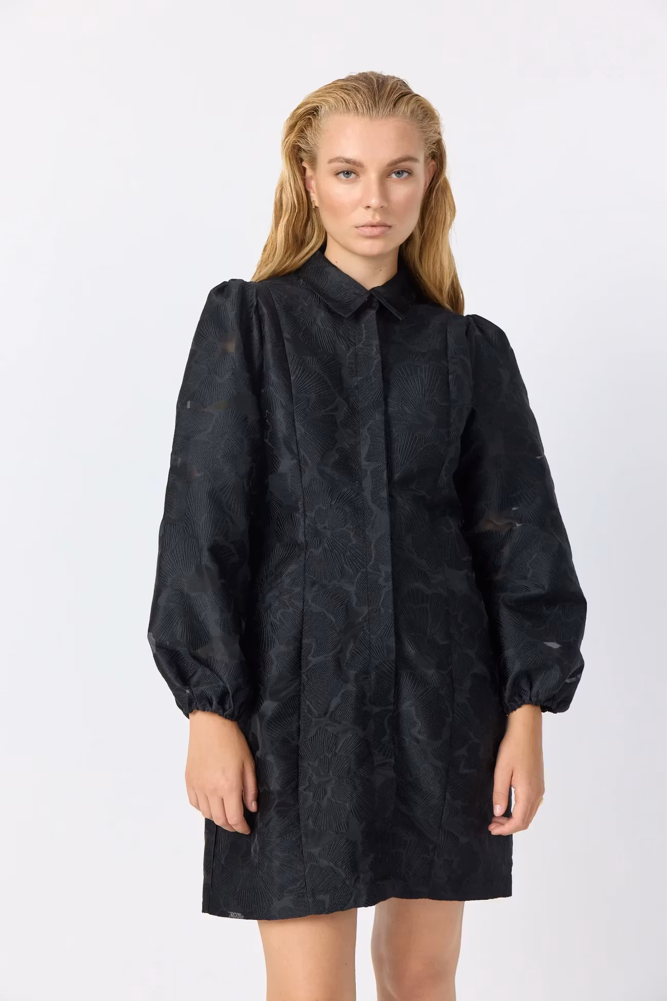En kort klänning designad i ett blommönster. Klänningen har en klassisk krage, knappslå och långa ärmar.