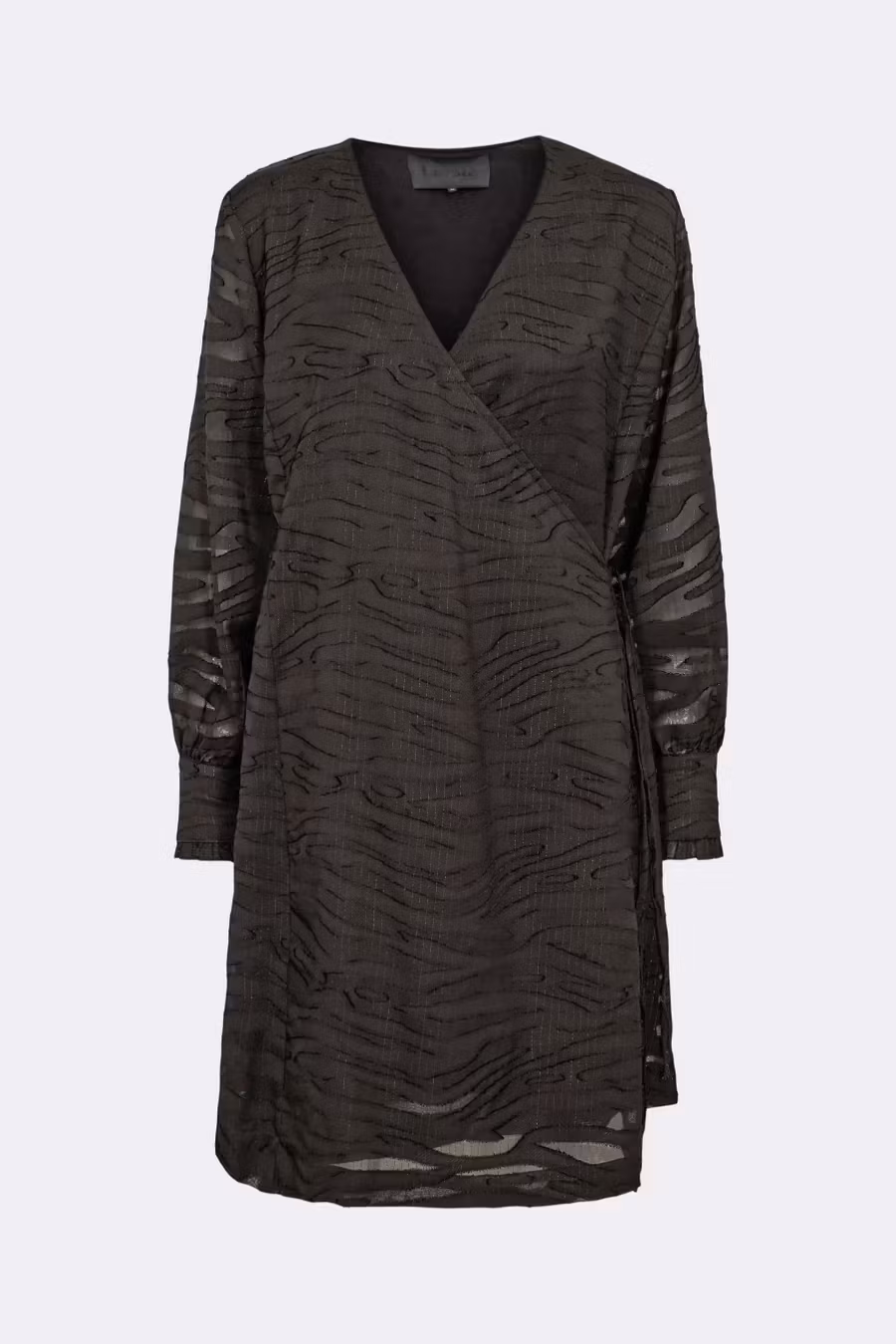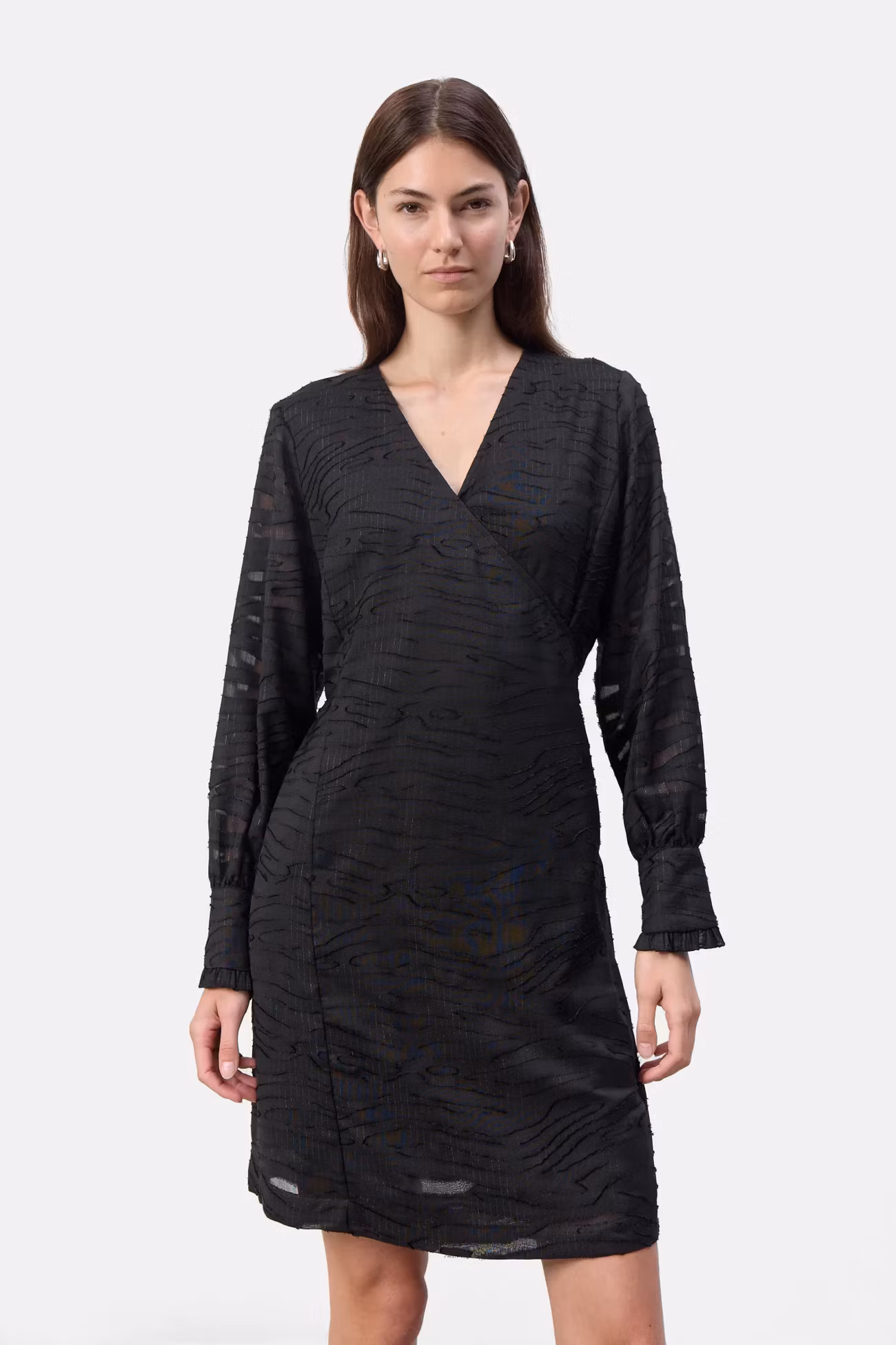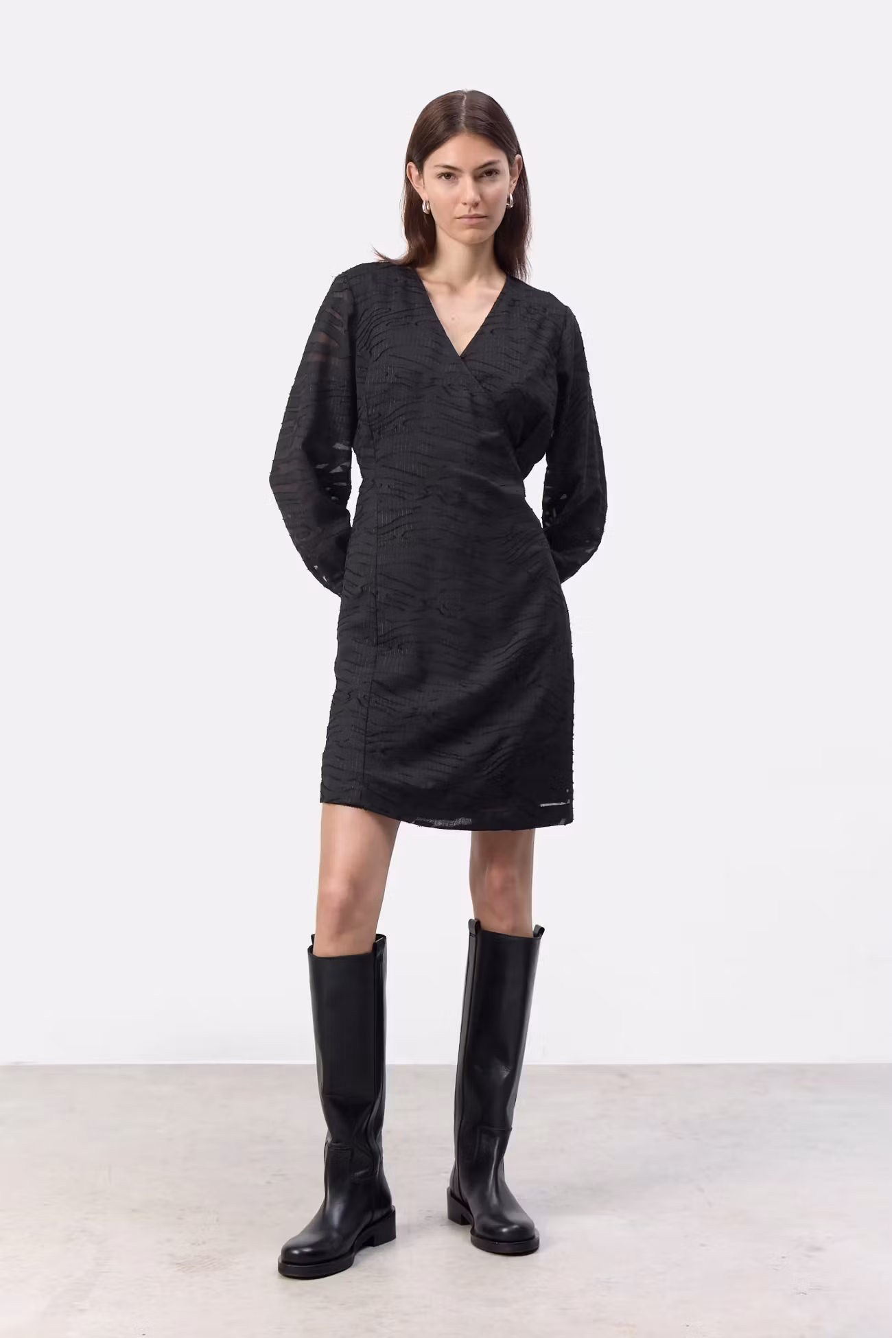 En omlott-klänning med långa, voluminösa ärmar och muddar med diskreta volanger. Klänningen har en omlett-effekt som fästs med ett knytband i midjan.
