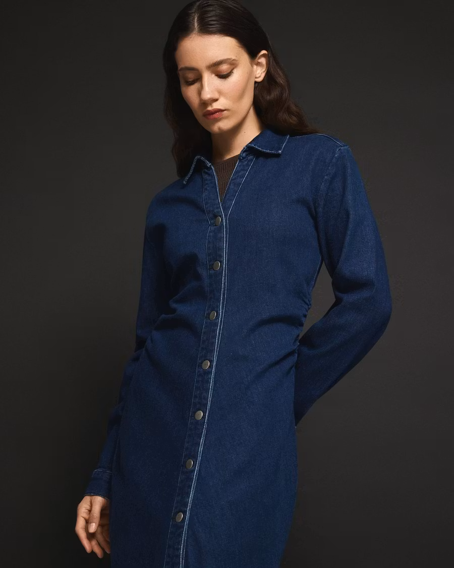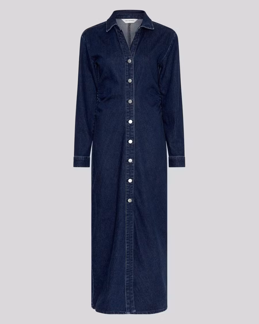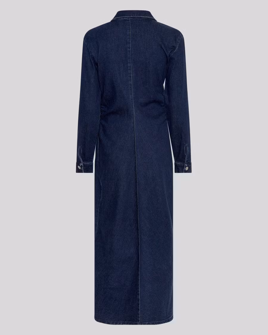 En lång denimklänning med klassisk skjortkrage och full knäppning framtill. Klänningen har tydliga sömmar och går både att klä till vardags och fest beroende på vad du sätter till.