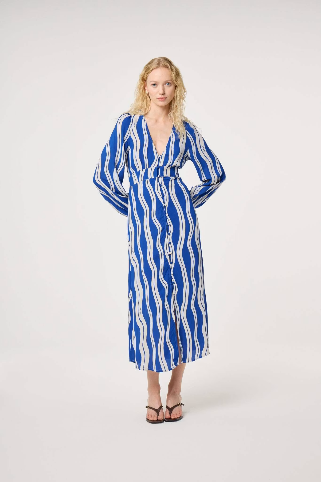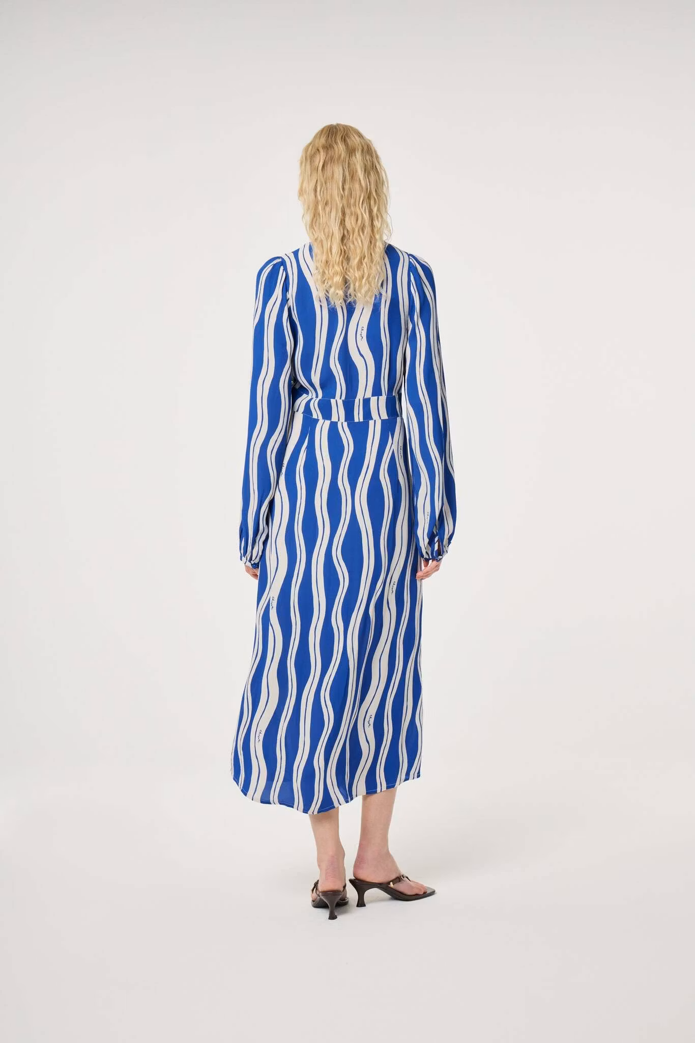 Långärmad, blårandig klänning tillverkad i ett lätt, bekvämt och luftigt material. Klänning är V-ringad, har dekorativa knappar framtill och fungerar både att klä upp och klä ned.