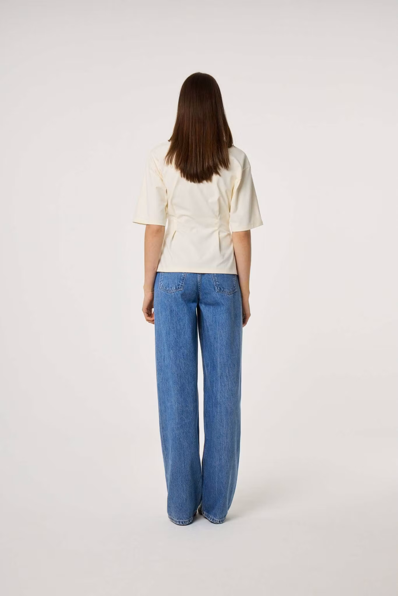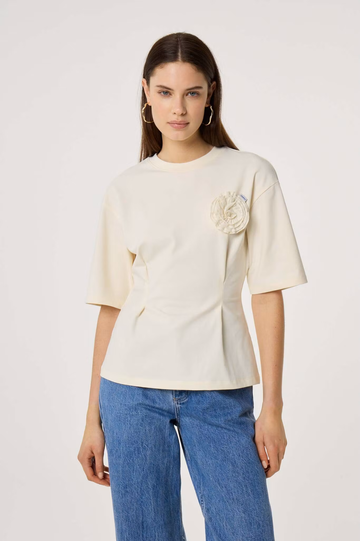 T-shirt med intagen midja och en vacker detalj framtill i form av en blomma. Blomman är avtagbar och fungerar som en brosch.