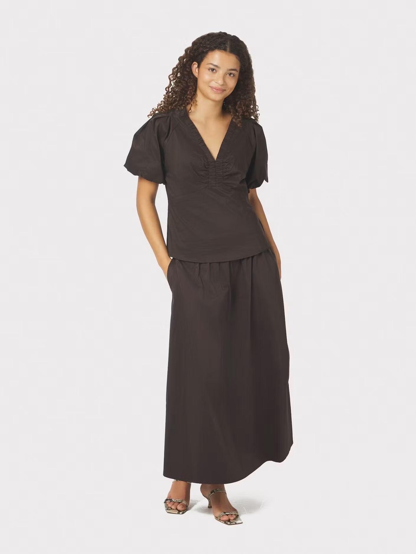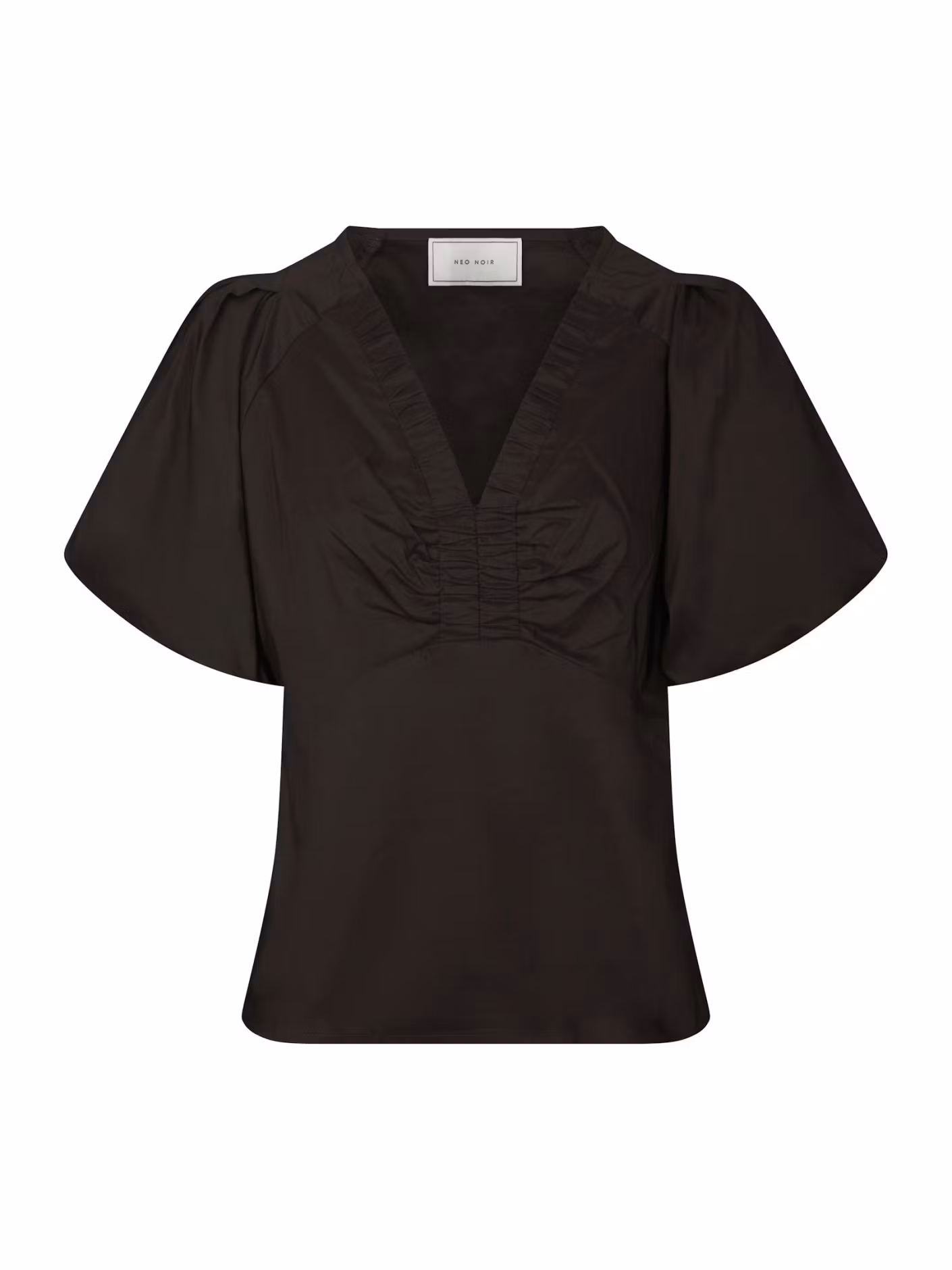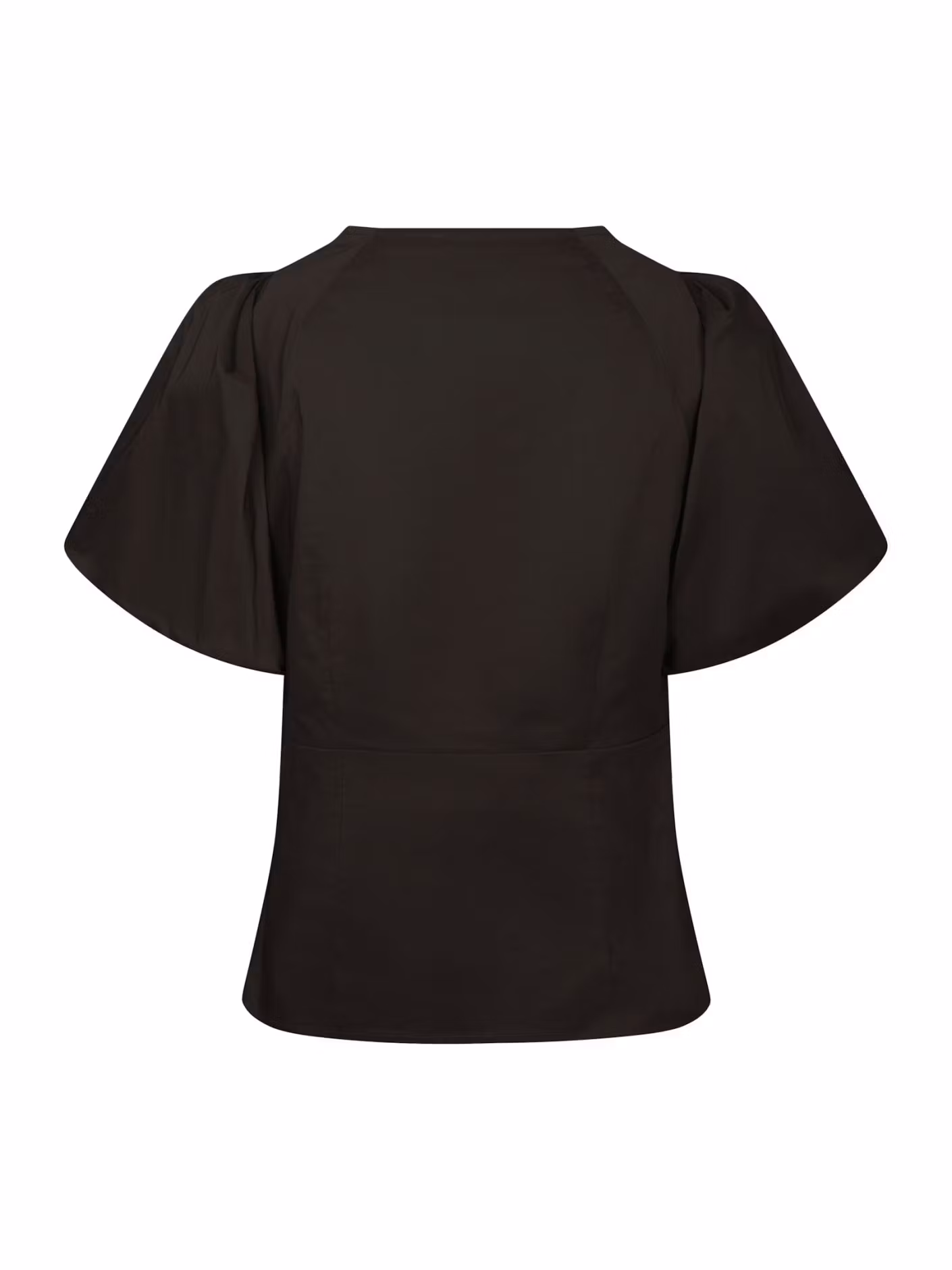 Blus i bomullspoplin med ärmar som slutar över armbågen och dold dragkedja. Blusen är V-ringad.
