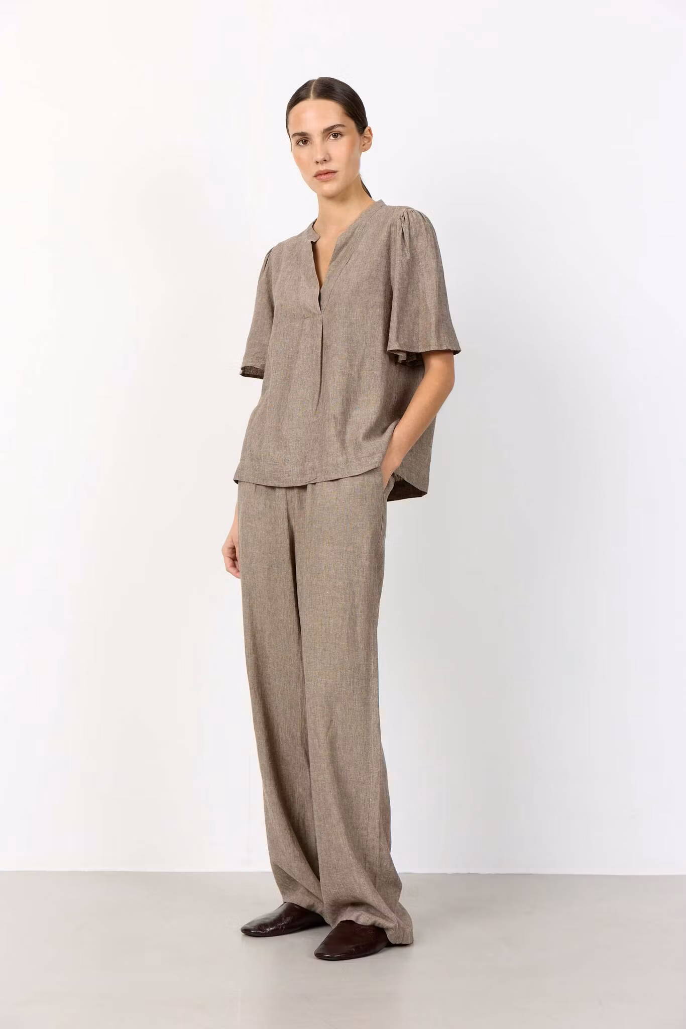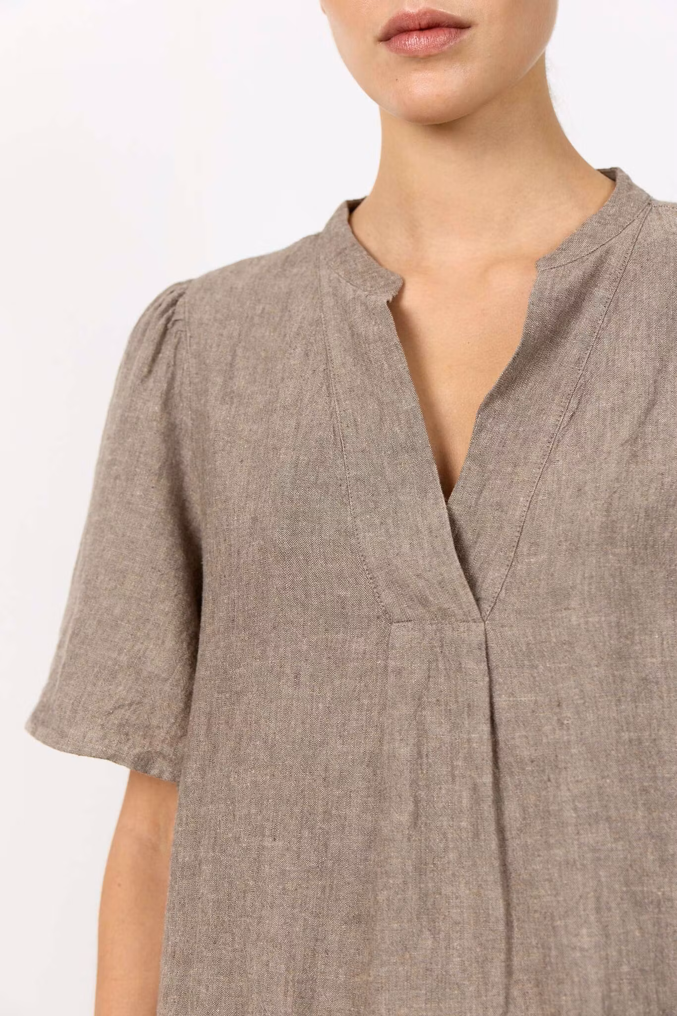 En linneblus från Levete Room tillverkad av 55% linne och 45% viskos. Blusen är V-ringad, har korta ärmar och en avslappnad passform.