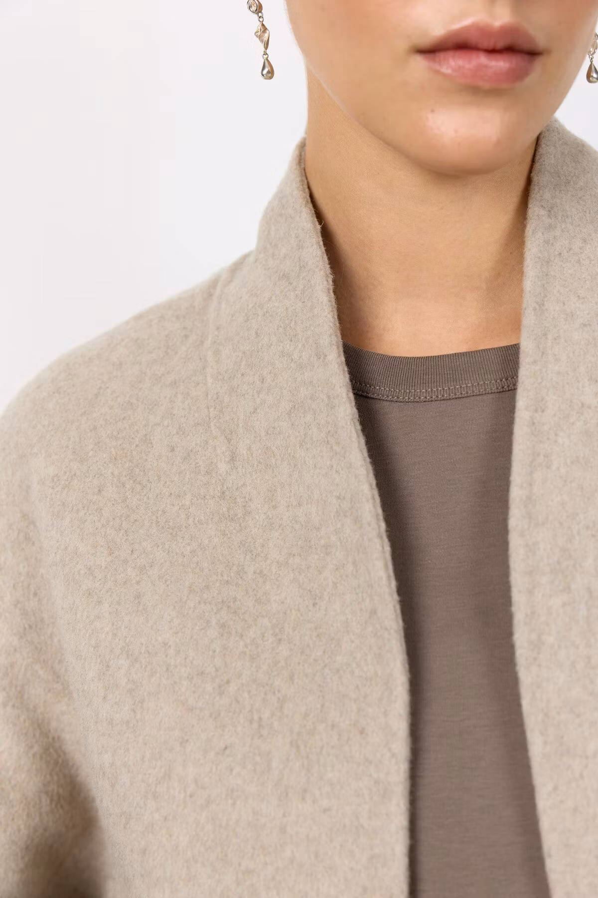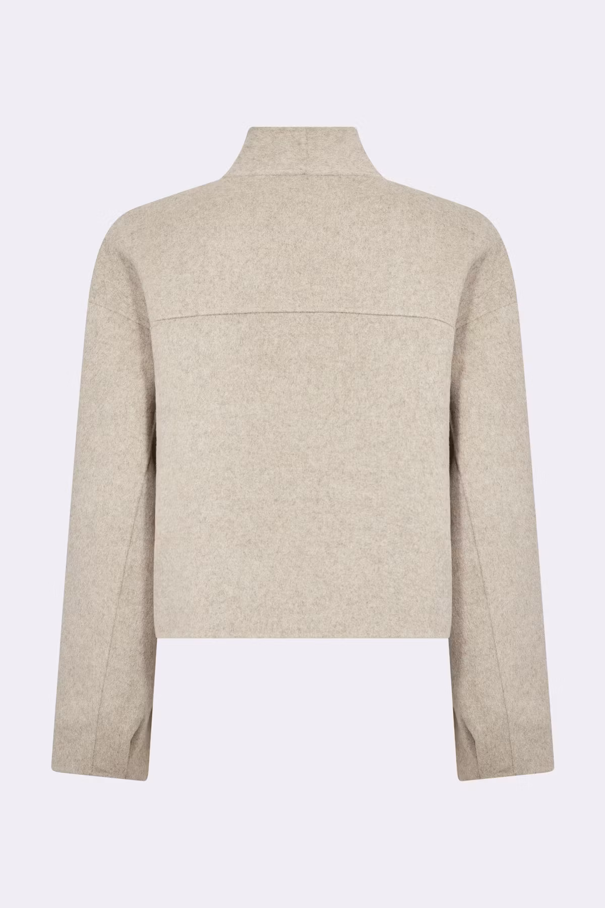 En minimalistisk jacka tillverkad av en ullblandning Jackan har en kraglös design med kort längd och en slät textur. Styla den över en enkel t-shirt eller en snygg blus för en elegant look.