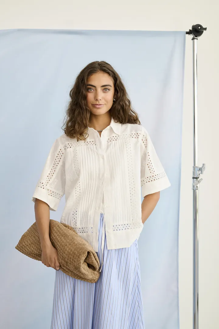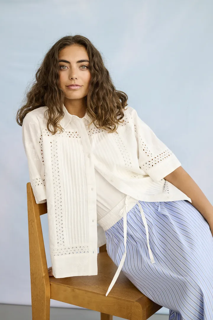 Kortärmad skjorta med boxig passform, knäppning framtill och klassisk krage. Skjortan har skira håldetaljer som syns vid ärmar, bröstparti och nederkant.