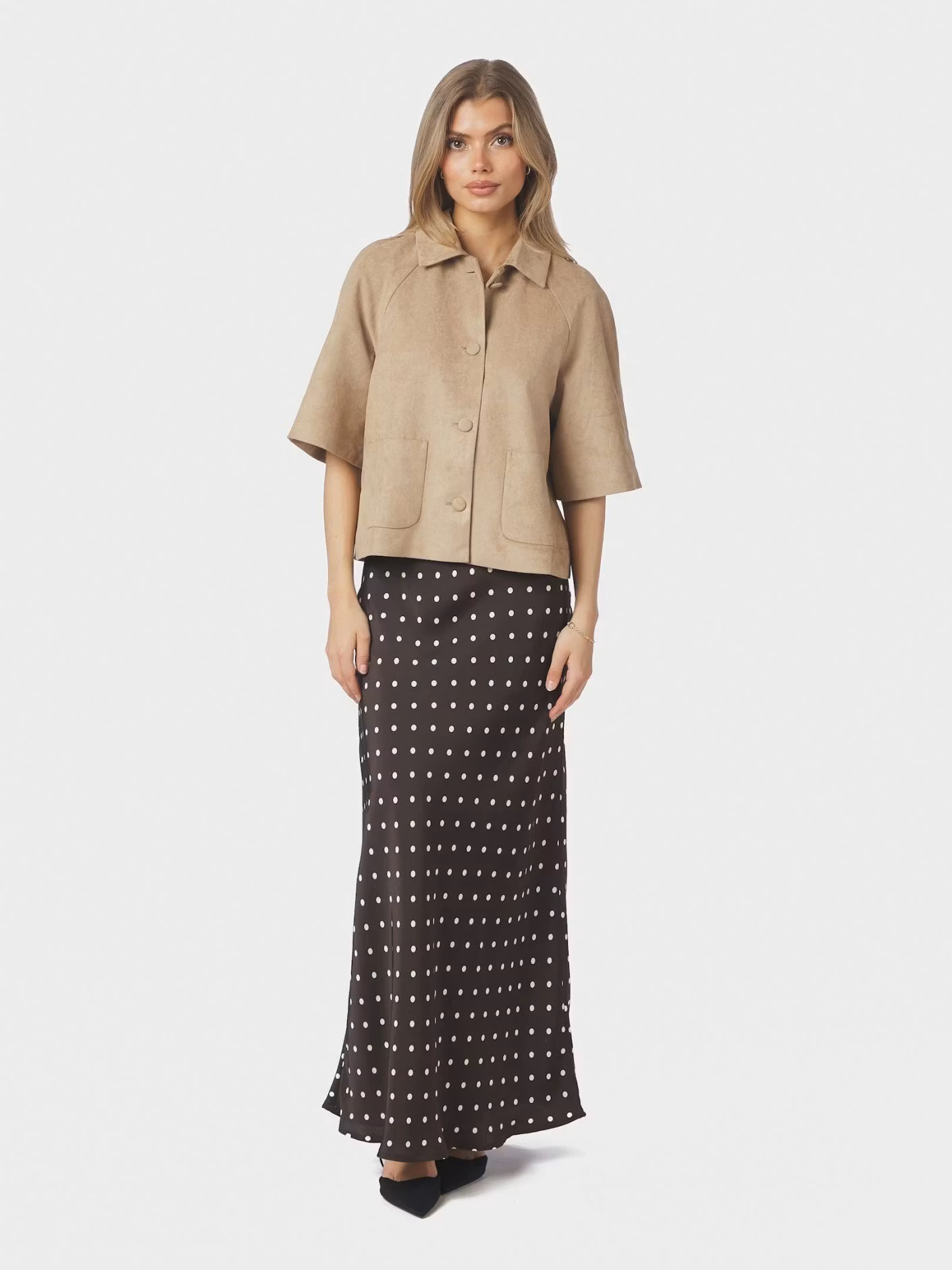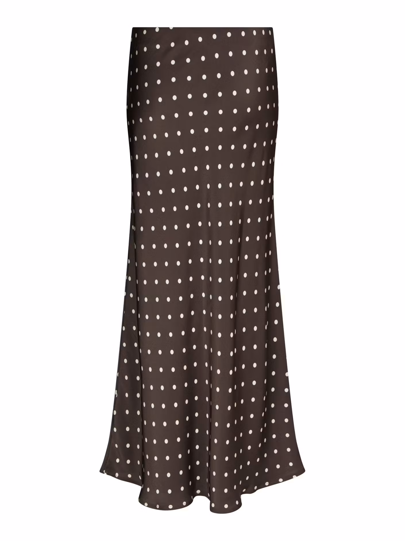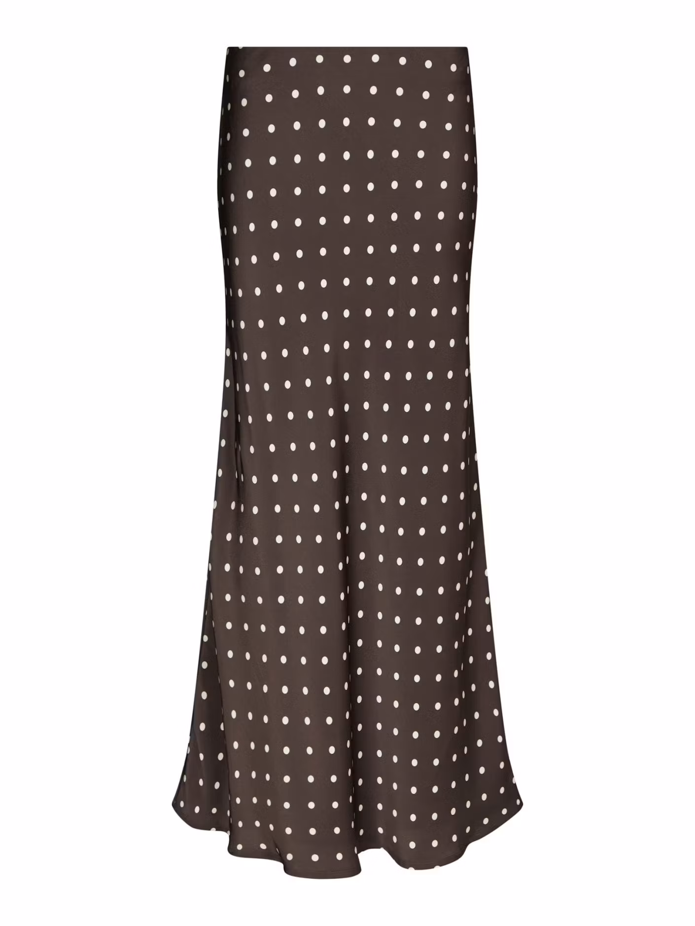Lång prickig kjol med resår i midjan. Kjolen är snedskuren vilket skapar ett fint fall.