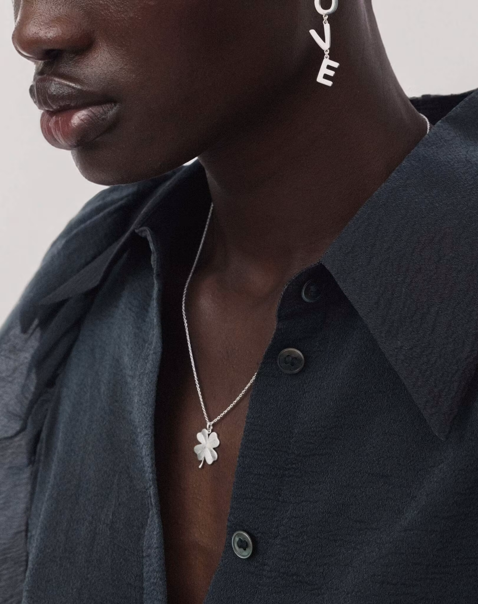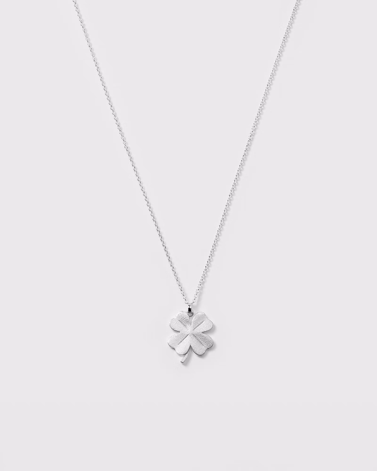 En kort oval kedja med ett matt hänge förställande en fyrklöver, vilket ger en exklusiv känsla. Halsbandet är gjort av sterling silver.
