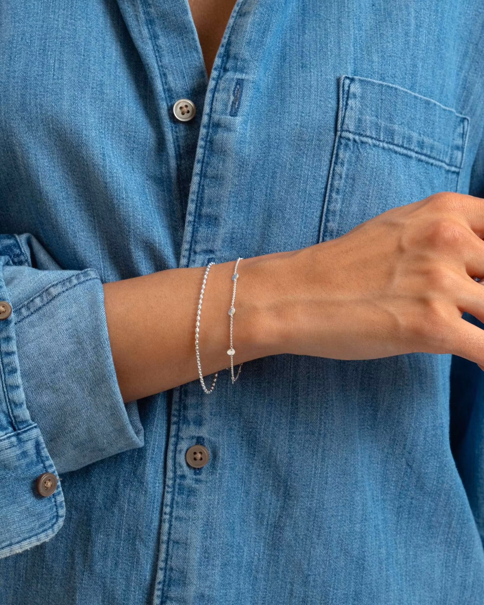 Ett unikt, tunt armband dekorerat med små runda hamrade cirklar som ger smycket en fin handgjord känsla. Tillverkat i äkta sterlingsilver, 100% återvunnet. Perfekt att bära ensamt eller i kombination med andra smycken.